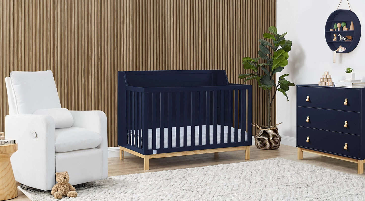 The babyGap Oxford Nursery Set by Delta Children includes a crib, dresser, glider, mattress, mattress pad, and sheets and features a modern design that every parent dreams of for their nursery.
