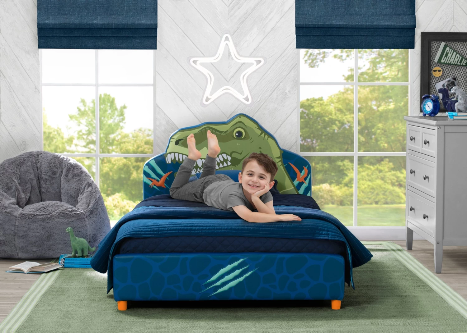 This Dinosaur Upholstered Twin Bed by Delta Children brings prehistoric style to any space. A great choice for future paleontologists, it features a big green T-Rex on the headboard and three-dimensional detailing on the footboard. Fully upholstered in faux leather with a sturdy and durable hardwood frame, this kids’ bed creates a magical and safe sleep space that will inspire dreams of dinosaur digs. No box spring required. Mattress not included.