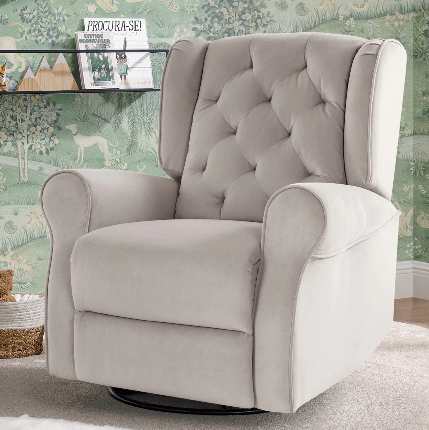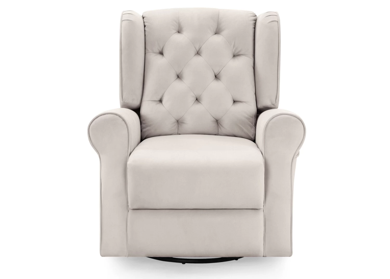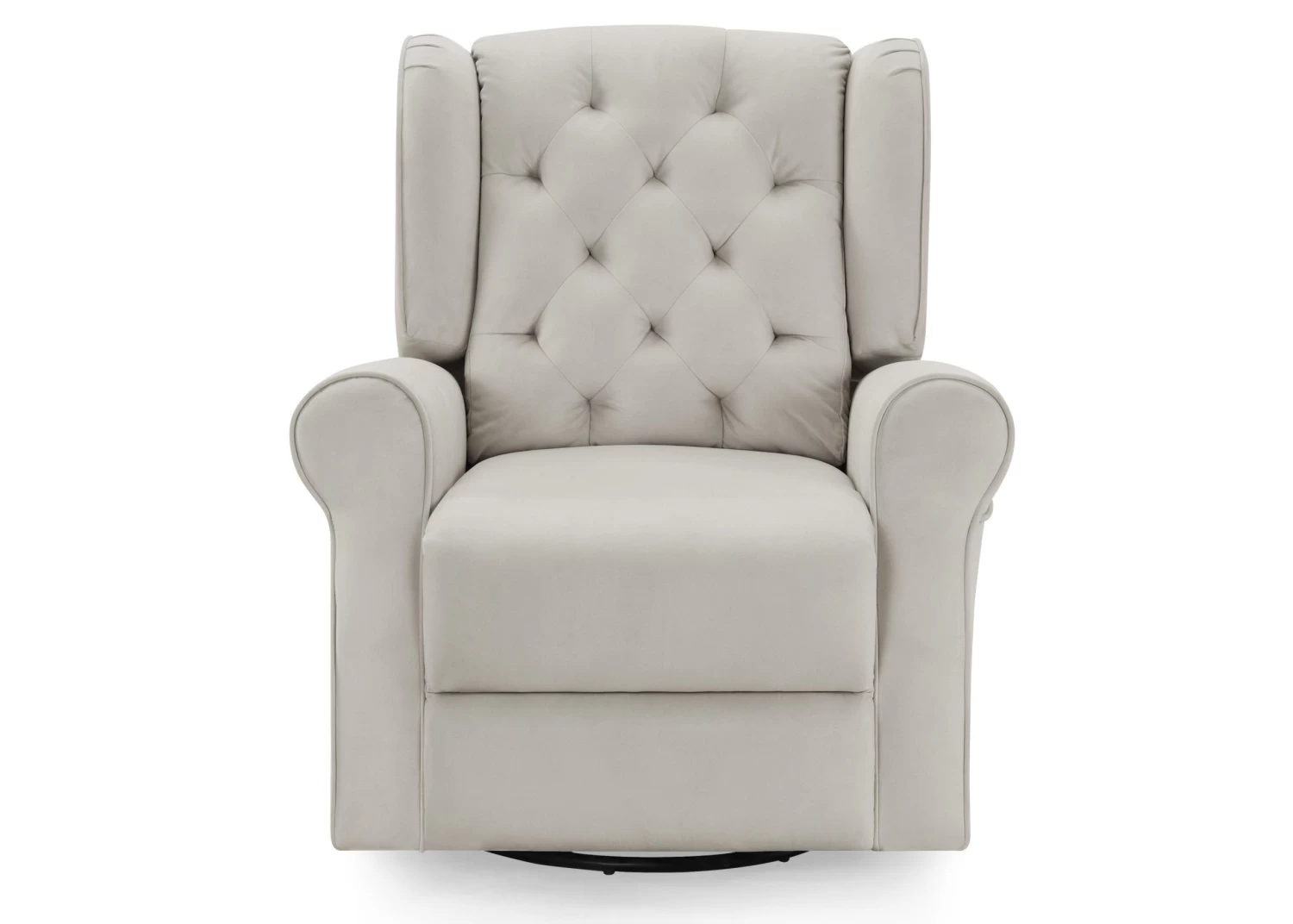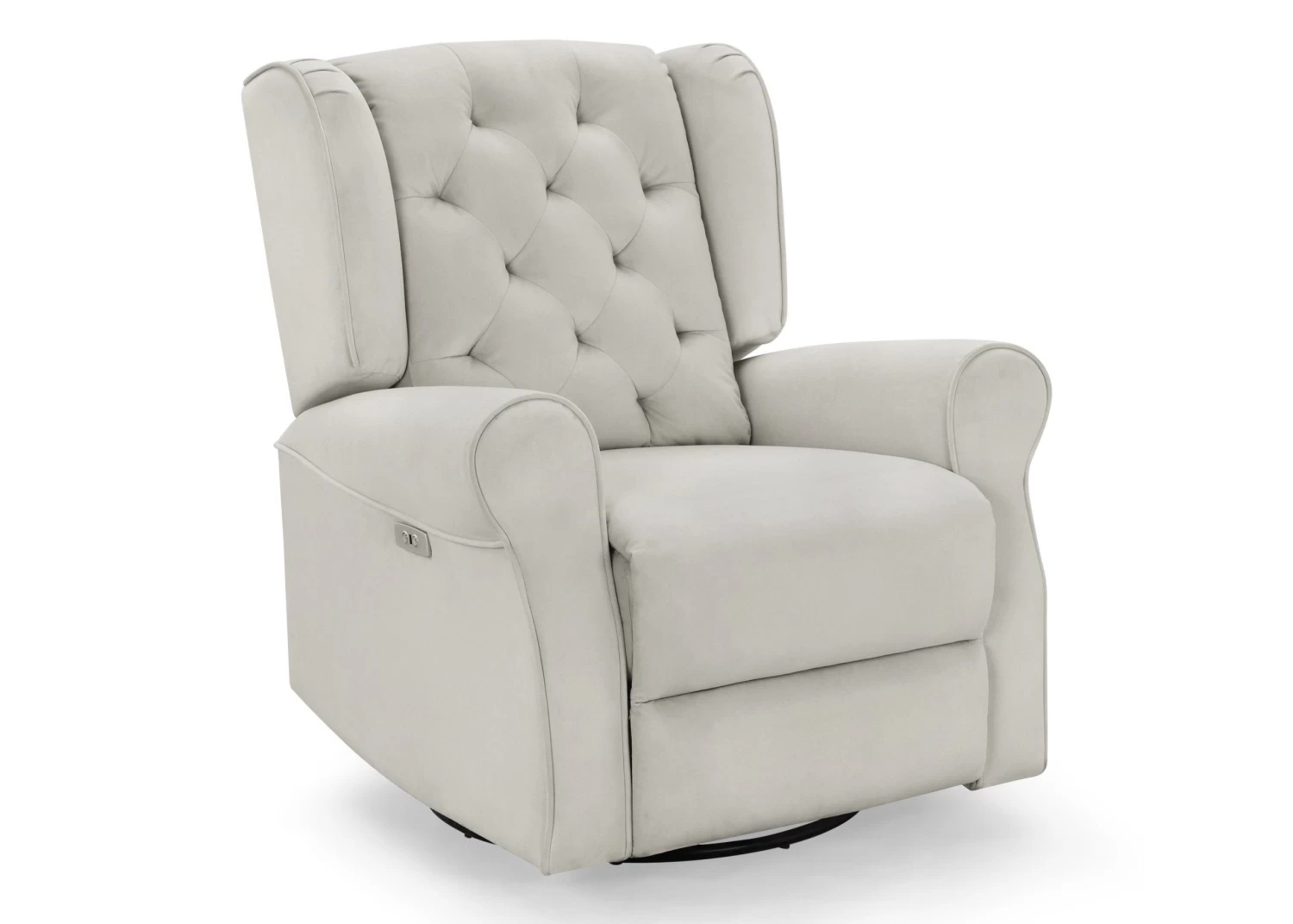 Rest and recharge with the Emmie Electronic Power Recliner and Swivel Glider by Delta Children. The sophisticated Emmie features classic good looks with its tufted detailing and supreme comfort with its deep seat, supportive cushions and padded armrests. The seat swivels, rocks and reclines to multiple positions, and it offers plenty of shoulder and elbow room for comfortable feeding and snuggling with your baby. On the side of the chair, youâll find buttons that control reclining, plus a USB port, so your electronics are always fully charged. Designed for ease, the placement of these buttons and port are more conveniently placed than other recliners on the market! And the recliner swivels 270-degrees with a smooth gliding motion, so you won’t disrupt your little one’s sleep while you get comfortable. Incredibly easy to keep clean, this recliner is upholstered in performance LiveSmart fabric that repels liquid and is stain resistant. The Emmie Electronic Power Recliner and Swivel Glider by Delta Children is the ultimate nursery recliner for modern families.