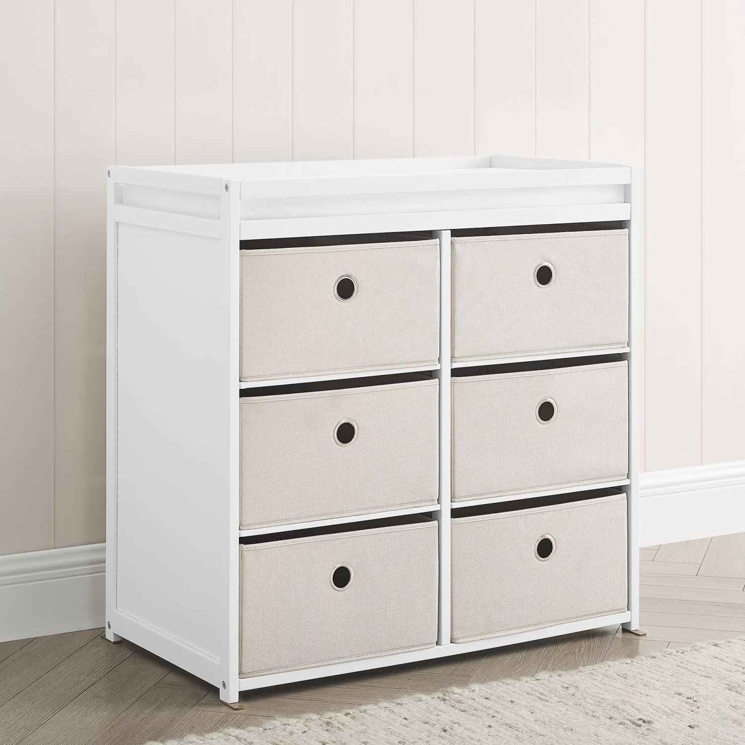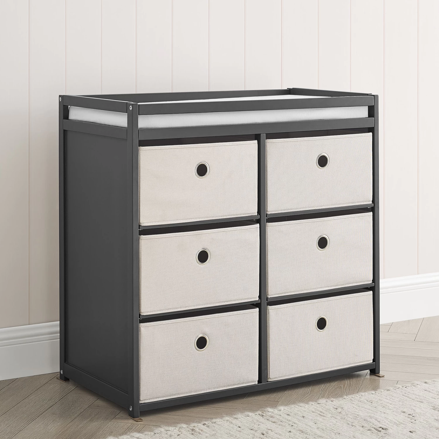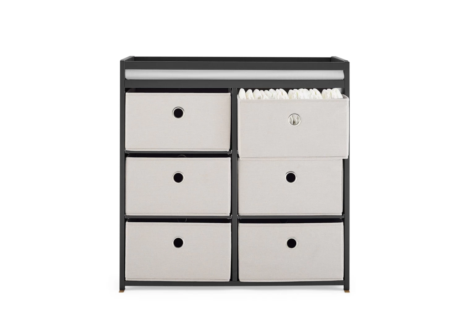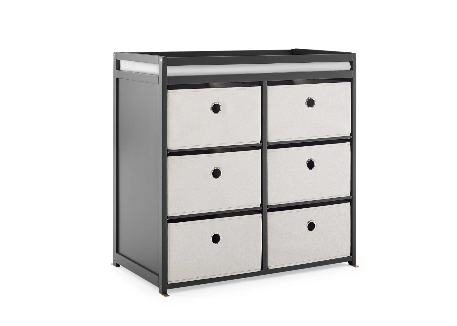 The Hayes Fabric Bin Changer by Delta Children is a practical place for diaper changing, dressing baby and more. To help you stay organized, it includes six collapsible baskets that are the ideal spot to store diapers, linens, baby blankets, lotions, and toiletries. Safety rails around all four sides of the changing area will keep your baby safe and secure. When your little one outgrows the need for a changing table, it becomes a useful and attractive storage unit that can hold toys and more, so you can continue using it for years to come.