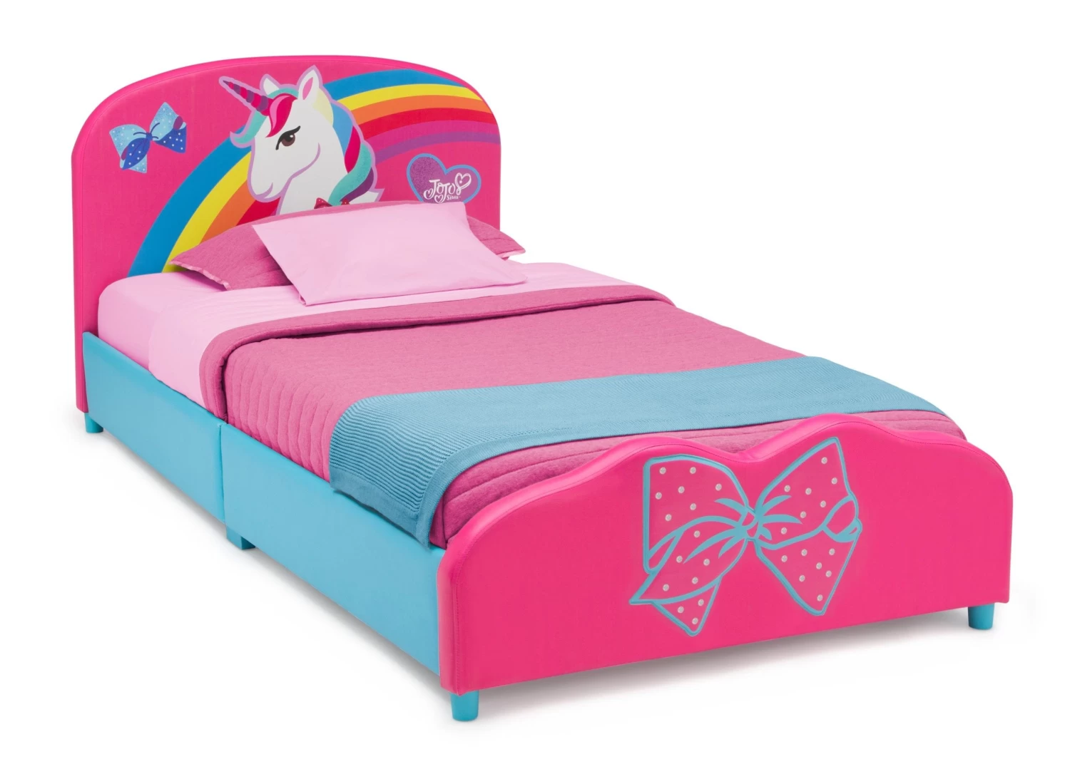 Encourage her to dream crazy big with the Nickelodeon JoJo Siwa Upholstered Twin Bed by Delta Children. The ultimate retreat for the JoJo Siwa fan, this twin bed bursts with character, and girlish charm, boasting enchanting graphics of a unicorn and rainbow on the headboard, while the footboard features 3D applique detailing of JoJo’s signature bow. A heart-shaped, JoJo Siwa logo and pink tones all over further channel the bubbly spirit of your child’s favorite dance star. Fully upholstered in faux leather with a sturdy and durable hardwood frame, this kids’ bed creates a cozy, magical and safe sleep space for the little superstar in your life. It’s a super-cool place where she can nap, sleep or catch up on her favorite show, The JoJo & BowBow Show Show.