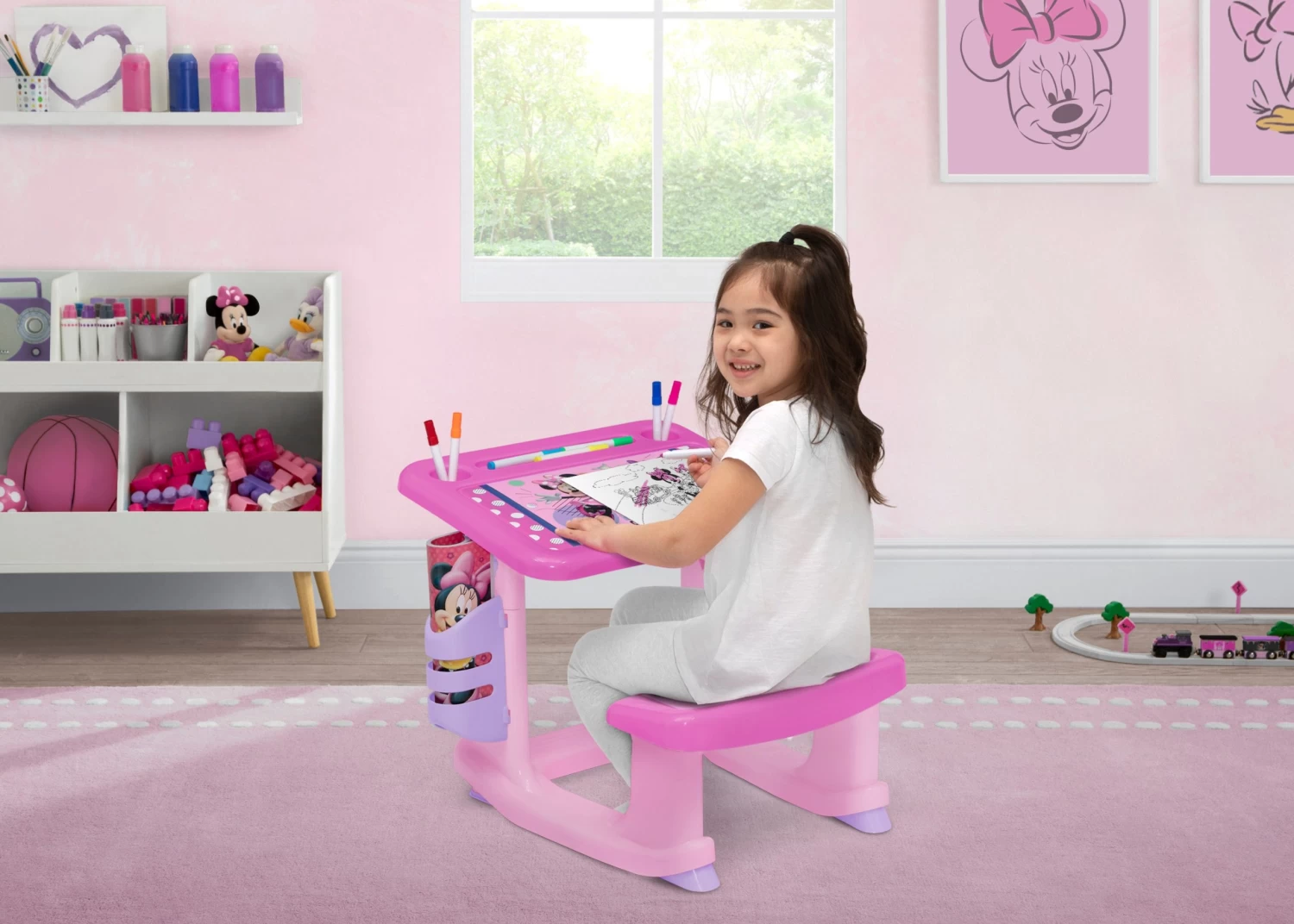Your little Mouseketeer will love creating one-of-a-kind masterpieces on this Disney Minnie Mouse Draw and Play Desk by Delta Children! A colorful spot to paint or draw, this sturdy art desk with bold Minnie Mouse graphics, an included 10-pack of markers and 4 coloring pages helps inspire creative play. Tons of storage space for the included markers and coloring pages makes tidying up easy. The desk’s built-in bench seat and footrest ensure your little one stays comfy while they play. Recommended for ages 2 years and up.