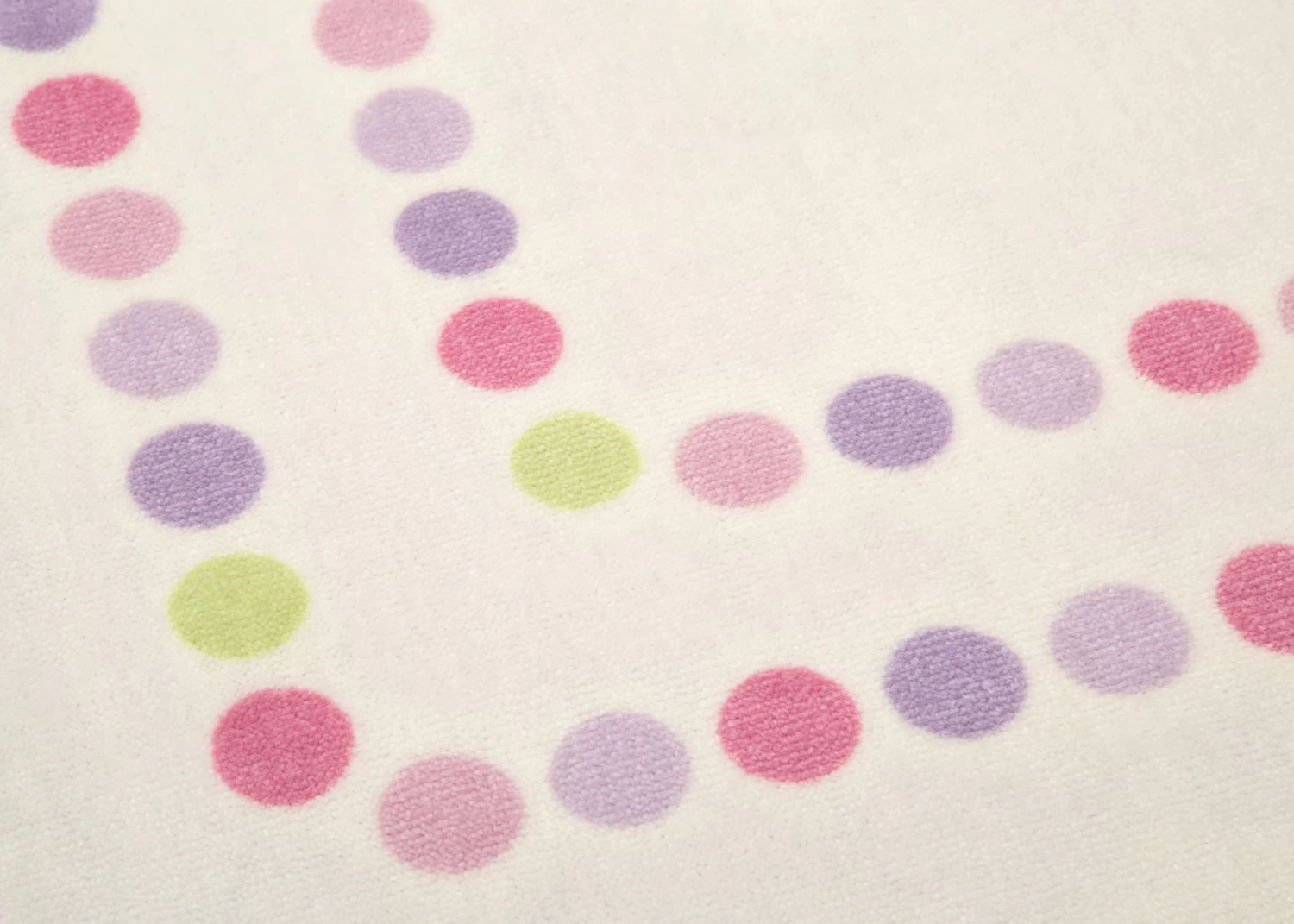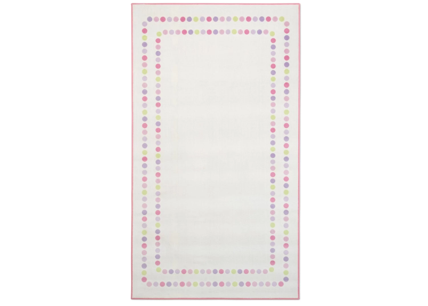 Add timeless style you your little oneâs space with this Pearl Dot Rectangle Area Rug by Delta Children. This fun rug features a double row of polka dots in pastel colors along the border. A great option for your childâs bedroom or playroom, this generously sized area rug is made from soft and durable materials to ensure itâs the perfect place to sit and play or read. The rugâs non-slip latex backing makes it safe to use on types of flooring and reinforced borders prevent fraying.