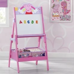 Bring the playful spirit of Peppa Pig to your little oneâs space with the Peppa Pig Wooden Activity Easel with Storage by Delta Children. This endearing kidsâ easel features a magnetic dry-erase surface, offering the perfect canvas for curious imaginations to go hog wild. The included alphabet magnets encourage even more learning and creative play. Sporting sweet scenes from Peppa Pig, your little artist will love crafting masterpieces with her favorite cheeky companion by her side. Two fabric storage bins underneath offer ample space to keep art supplies within easy reach, while the strong and sturdy wood construction ensures years of lasting use.