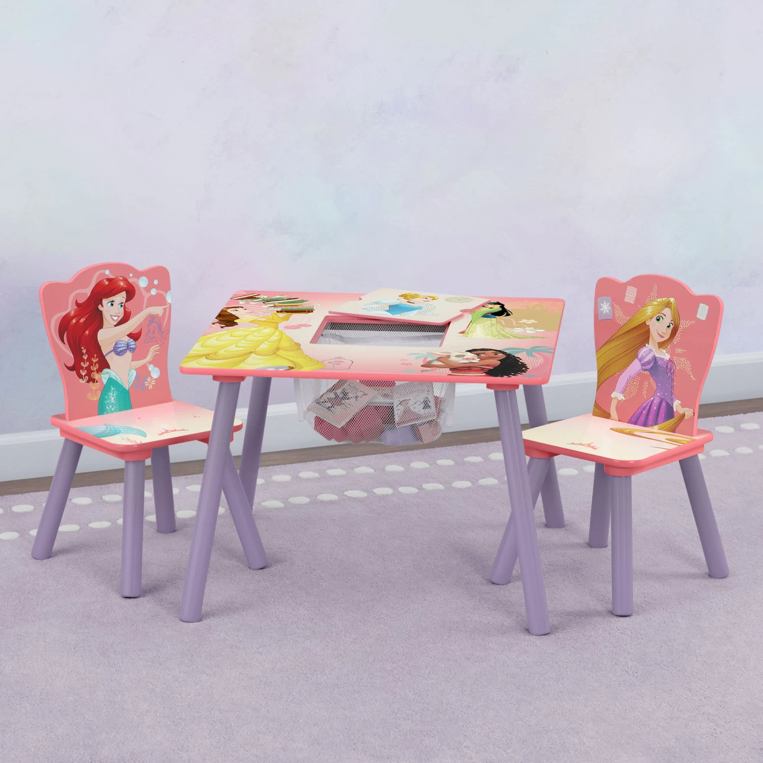 Bring royalty home with this Disney Princess Table and Chair Set with Storage by Delta Children. Featuring colorful graphics of Cinderella, Ariel, Moana, Belle, Mulan and Rapunzel, this table and chair set will spark imaginations. Making any activity extra-special, this kids table and chair set features a table and two chairs, designed at the perfect kid-sized height, making it ideal for snack time, playtime or homework. Plus, a built-in storage compartment at the center of the table provides the perfect space to keep art supplies.
