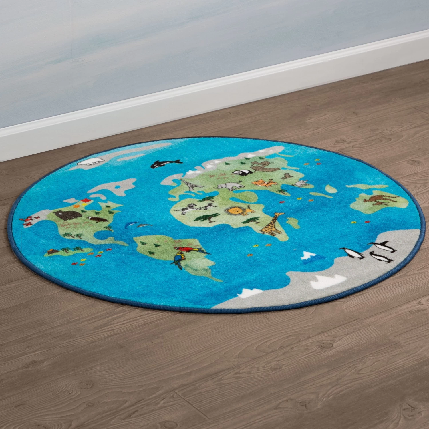 Kids will be on top of the world when theyâre standing on this rug! This whimsical World Map Round Area Rug by Delta Children features animals, forests and historical landmarks that are unique to each continent, making it easy for kids to imagine themselves exploring all the wonders of the world. An adorable and educational option for your childâs bedroom or playroom, this generously sized 39-inch round area rug is made from soft and durable materials to ensure itâs the perfect place to sit and play or read. The rugâs non-slip latex backing makes it safe to use on types of flooring and reinforced borders prevent fraying.