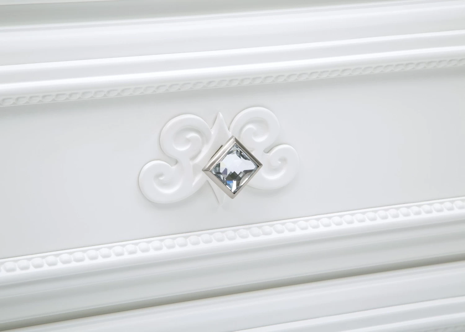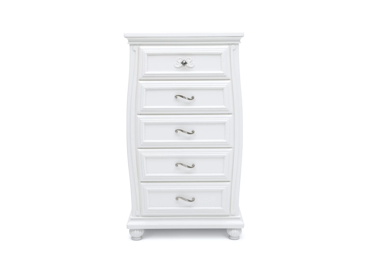 The Fairytale 5 Drawer Chest by Simmons Kids will be the crown jewel of any bedroom. Its exaggerated silhouette features curves inspired by the classic bombé shape for a whimsical touch while intricate carvings and bun feet balance the look. Five sliding drawers with swirl-shaped satin nickel pulls open to reveal a wealth of storage within. Acrylic knobs on each side of the chest provide additional storage space to hang accessories, like necklaces or headbands. To complete your bedroom or nursery, pair the Fairytale 5 Drawer Chest with coordinating items from the Simmons Kids Fairytale Collection.