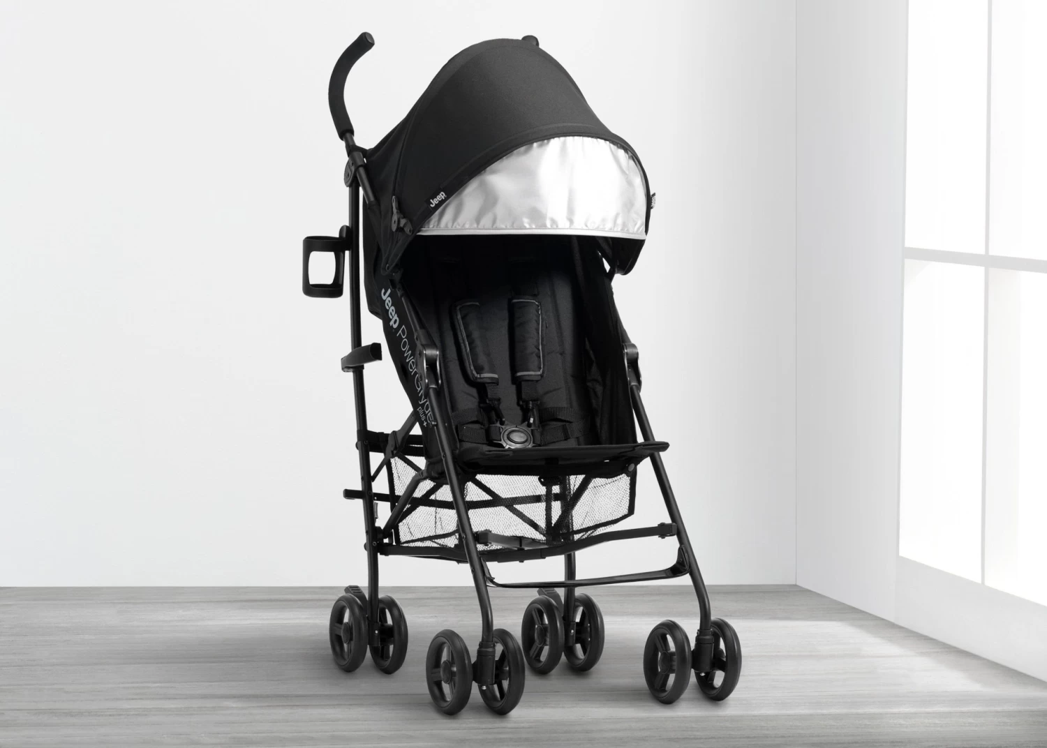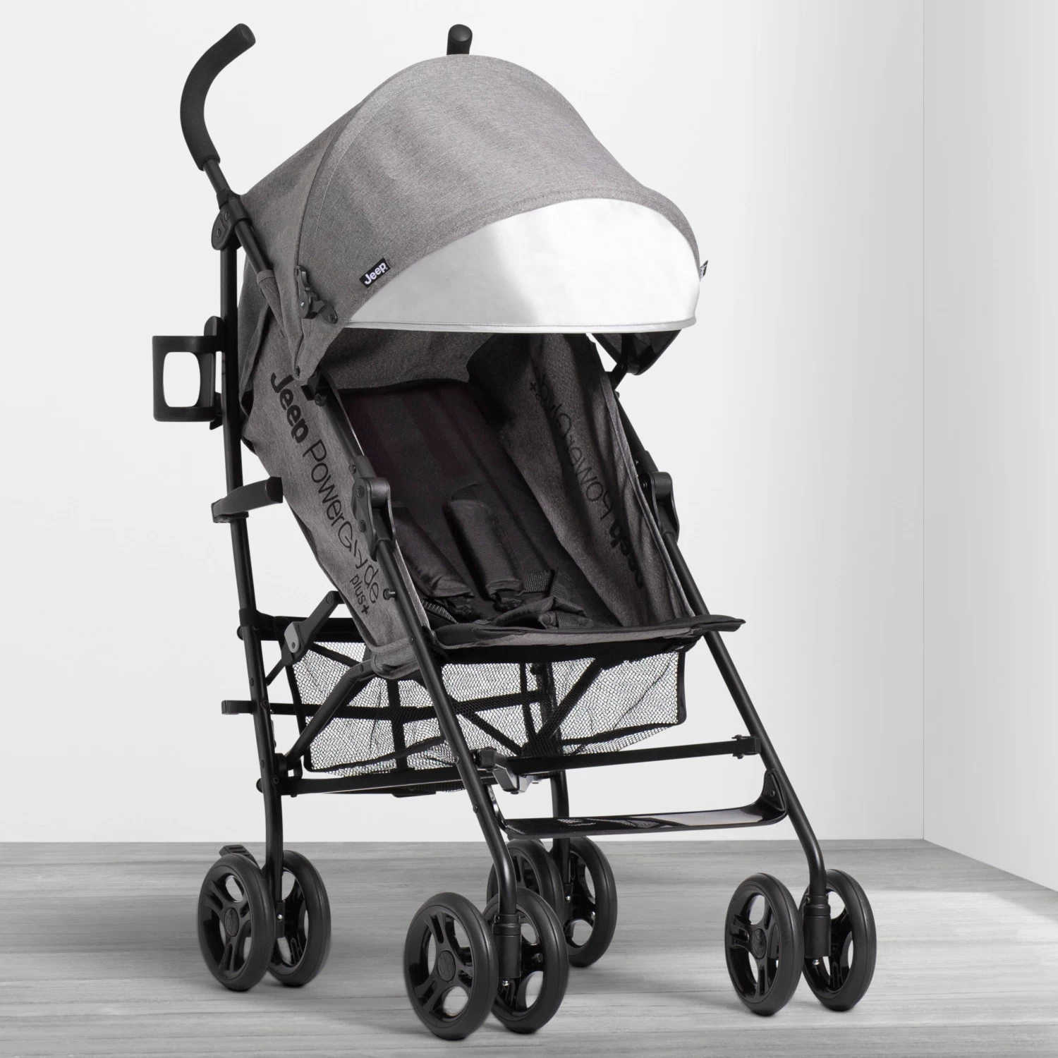 Wherever the road takes you, the Jeep PowerGlyde Plus Stroller by Delta Children will deliver the best ride ever. The Jeep PowerGlyde Plus offers the most advanced handling thanks to all-new front wheels that feature precision technology, making it easier than ever to glide, turn and maneuver any surface. Ideal for travel or everyday use, this extremely lightweight stroller with an aluminum frame weighs under 14 pounds and features a compact umbrella fold with an auto lock design and carry handle. An extra-large extendable canopy with UPF 50+ sun visor will protect your child from the elements and a four-position reclining seat ensures baby is comfortable during walks, near and far. Some additional features of this lightweight stroller include: five-point safety harness, extra-large storage basket, cup holder and swivel front wheels. This stroller is recommended for infants 6 months up to 50 pounds. Letâs Glyde!