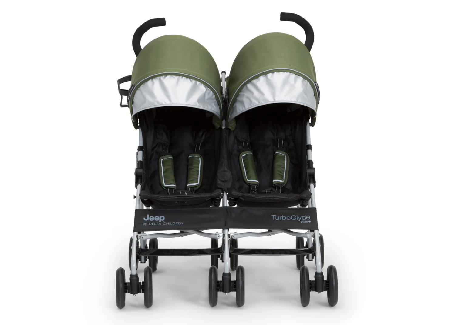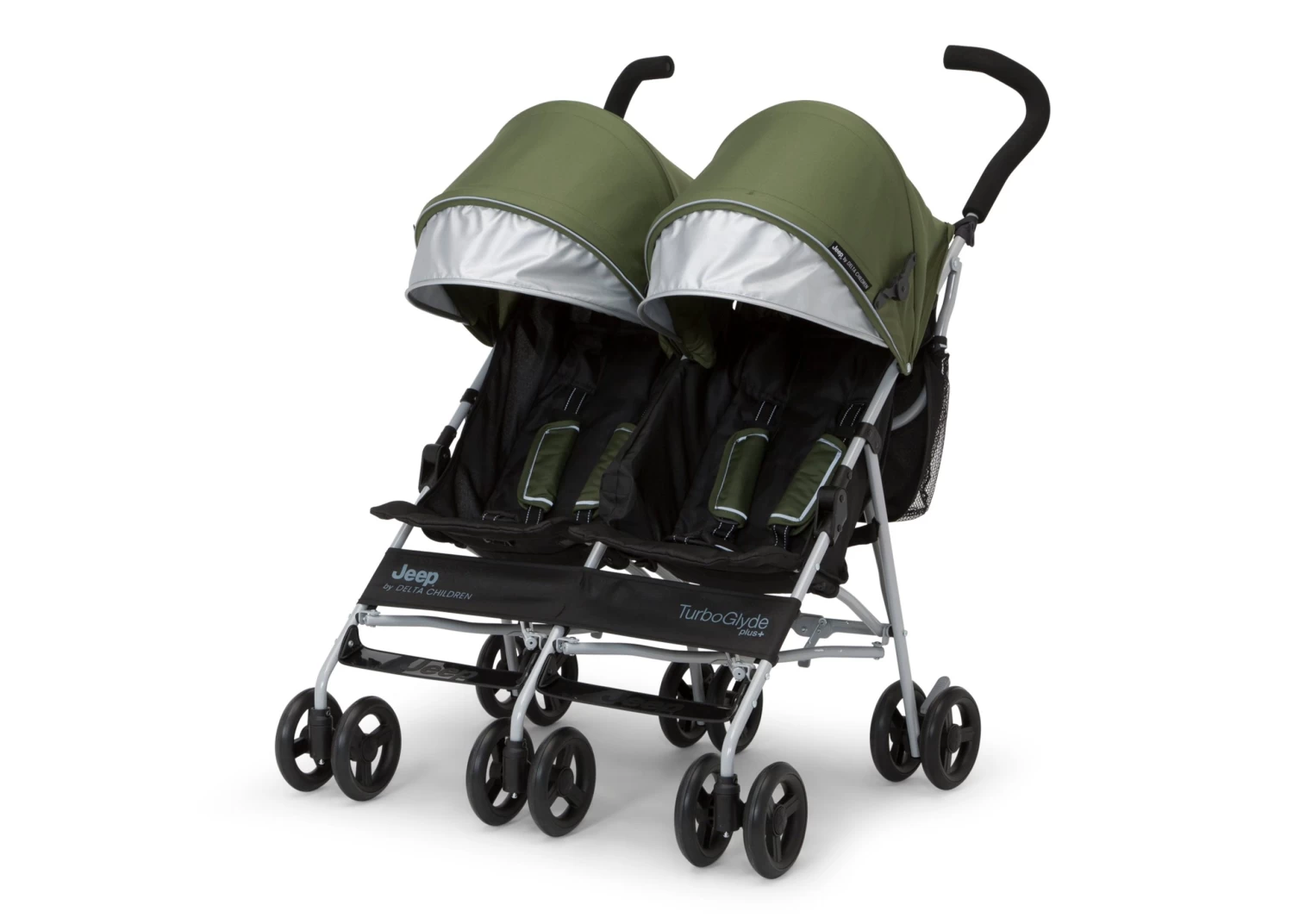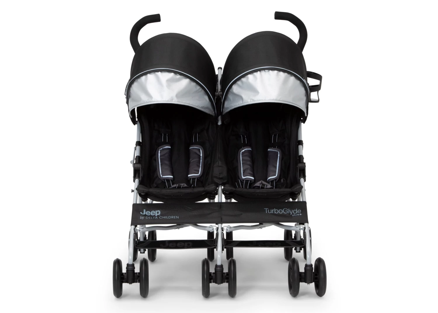 Looking for a wheel-y great ride for you and your growing family? Look no further than the Jeep TurboGlyde Plus Side-by-Side Double Stroller by Delta Children! Designed to deliver the best ride ever, the Jeep TurboGlyde Plus Side-by-Side Double Stroller offers the most advanced handling thanks to all-new front wheels that feature precision technology, making it easier than ever to glide, turn and maneuver any surface. Ideal for travel or everyday use, this extremely lightweight double stroller weighs under 20 pounds and features a compact umbrella fold design. An extra-large extendable canopy with UPF 50+ sun visor will protect your children from the elements while calf and footrests ensure kids are comfortable during walks, near and far. Some additional features of this lightweight double stroller include ergonomic handles, five-point safety harness with reflective piping, two storage pockets, extra-large parent cup holder and swivel front wheels. This stroller is recommended for infants 9 months up to 35 lbs. per seat (70 lbs. total). Let’s glyde!