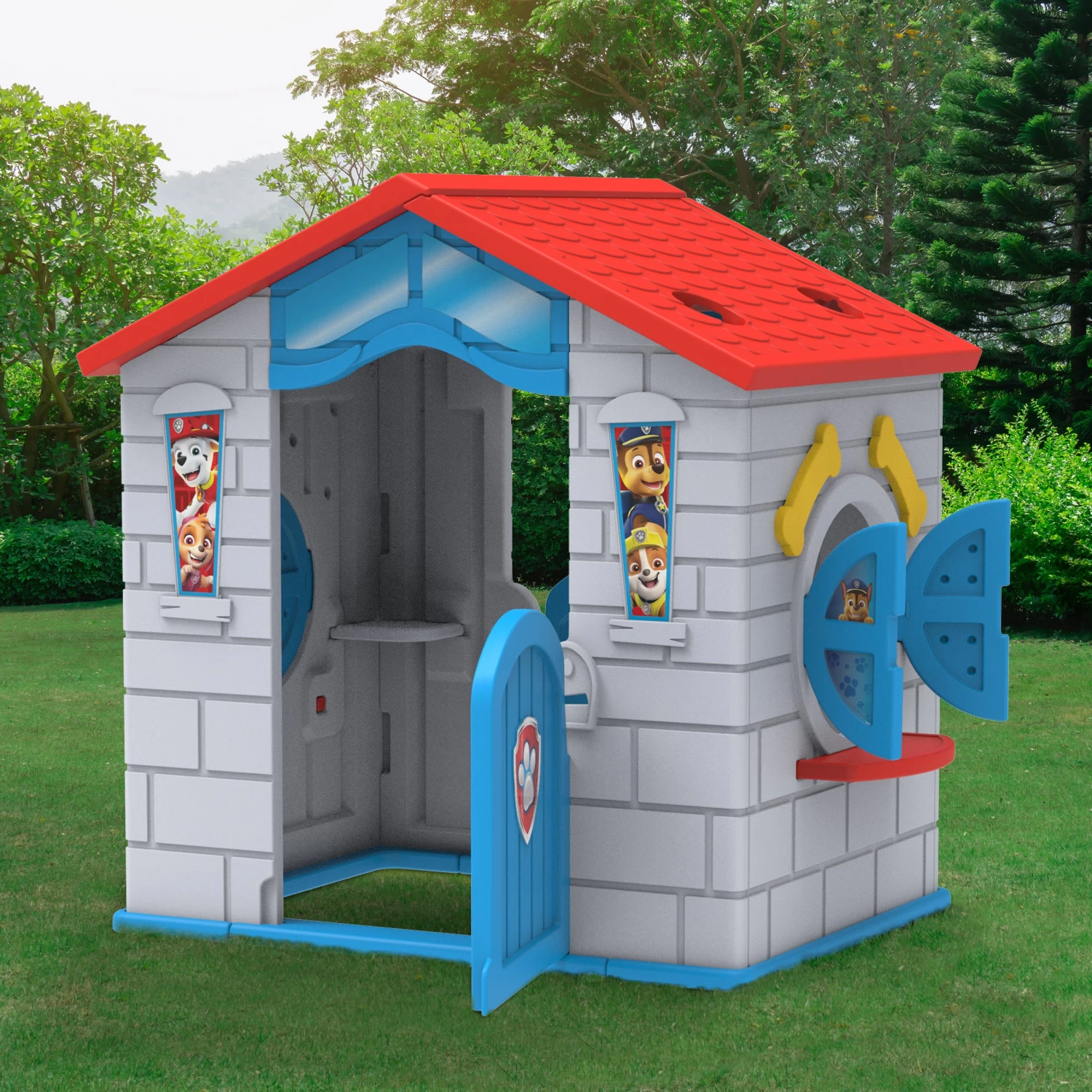 Keep kids entertained at home with this Nick Jr. PAW Patrol Plastic Indoor/Outdoor Playhouse by Delta Children! The incredibly easy snap-in assembly ensures the playhouse and action-packed adventure is ready for your child to experience in only a few minutes. Great inside or outside, this cool playhouse resembles the PAW Patrol’s rescue headquarters, The Lookout. A working periscope and four cutouts in the roof allow your child to keep close watch over Adventure Bay in every direction. Colorful character decals of Chase, Marshall, Rubble and Skye ensure your little one can easily alert the PAW Patrol if they spot trouble during their visual sweep. A fun place for pretend play and child development, this playhouse stimulates imaginations and fine motor skills with its two Dutch-style doors, working shutters, mail slots, plus built-in interior and exterior tables for crafts, snacks and more. The spacious interior space is large enough for several kids to play at the same time and the durable plastic construction is non-toxic, odorless and weather-and fade-resistant to withstand years of use in the backyard, playroom or basement.